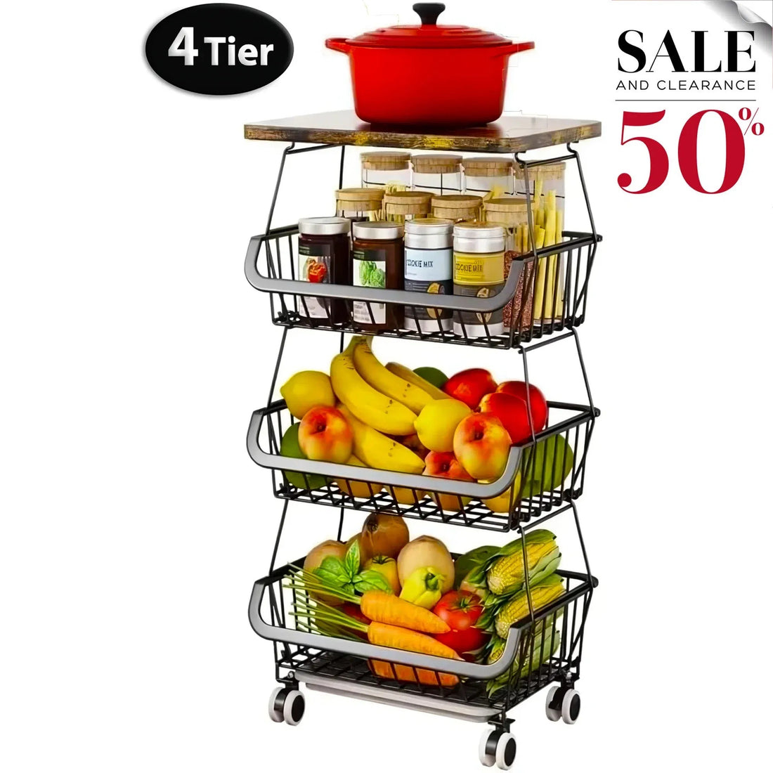 Tier Fruit Basket For Kitchen Organizers And Storage,with Solid Wood Top,Stackable Metal Wire Basket Stand Cart With Wheels For Fruit Vegetable