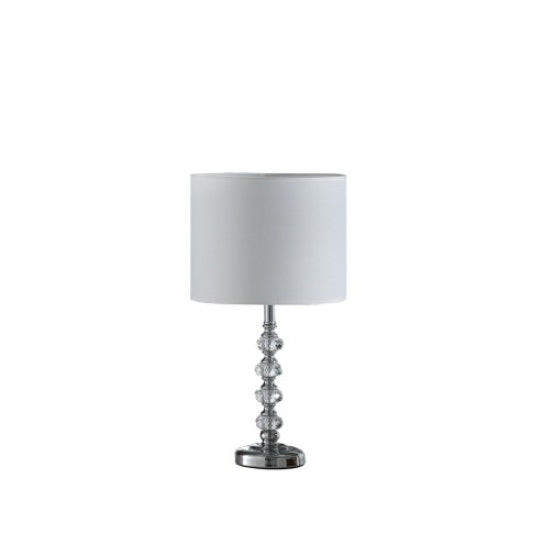 - White Uno-Fitter Cotton/Linen Drum Shade measures 9.5"L x 9.5"W x 7.5"H. 4 pcs Crystal Cut Orb/Chrome Table Body measures 4.25"L x 4.25"W x 11.5"H.