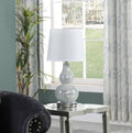- White Uno-Fitter Cotton/Linen Semi-Drum Shade measures 9.75"L x 8.25"W x 8"H. Glass Mirror Mosaic Chrome Table Body measures 6"L x 6"W x 14.75"H.