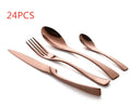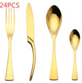 Specifications: Titanium Steak Knife, Titanium Main Meal Knife, Titanium Main Meal Spoon, Titanium Main Meal Fork, Titanium Tea Spoon, Real Gold Steak Knife, Real Gold Main Meal Knife, Real Gold Main Meal Spoon, Real Gold Main Meal Fork, Real Gold Teaspoon, set of four titanium