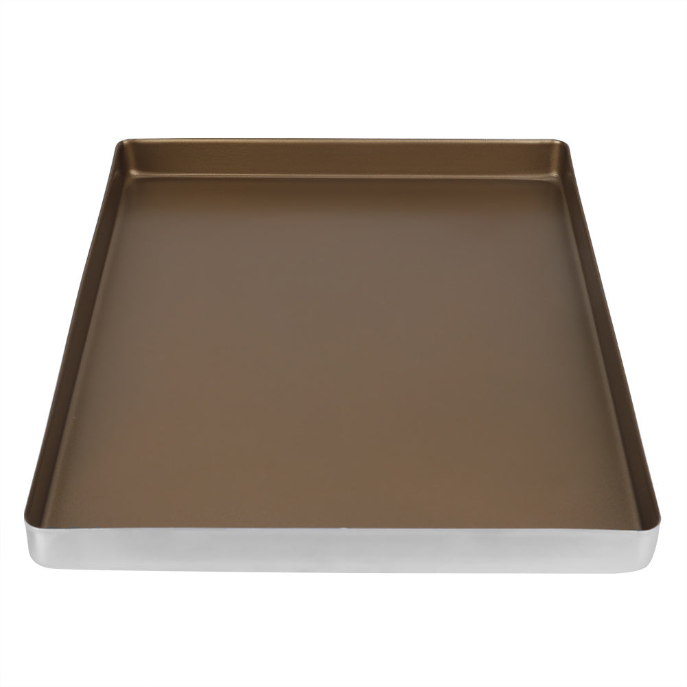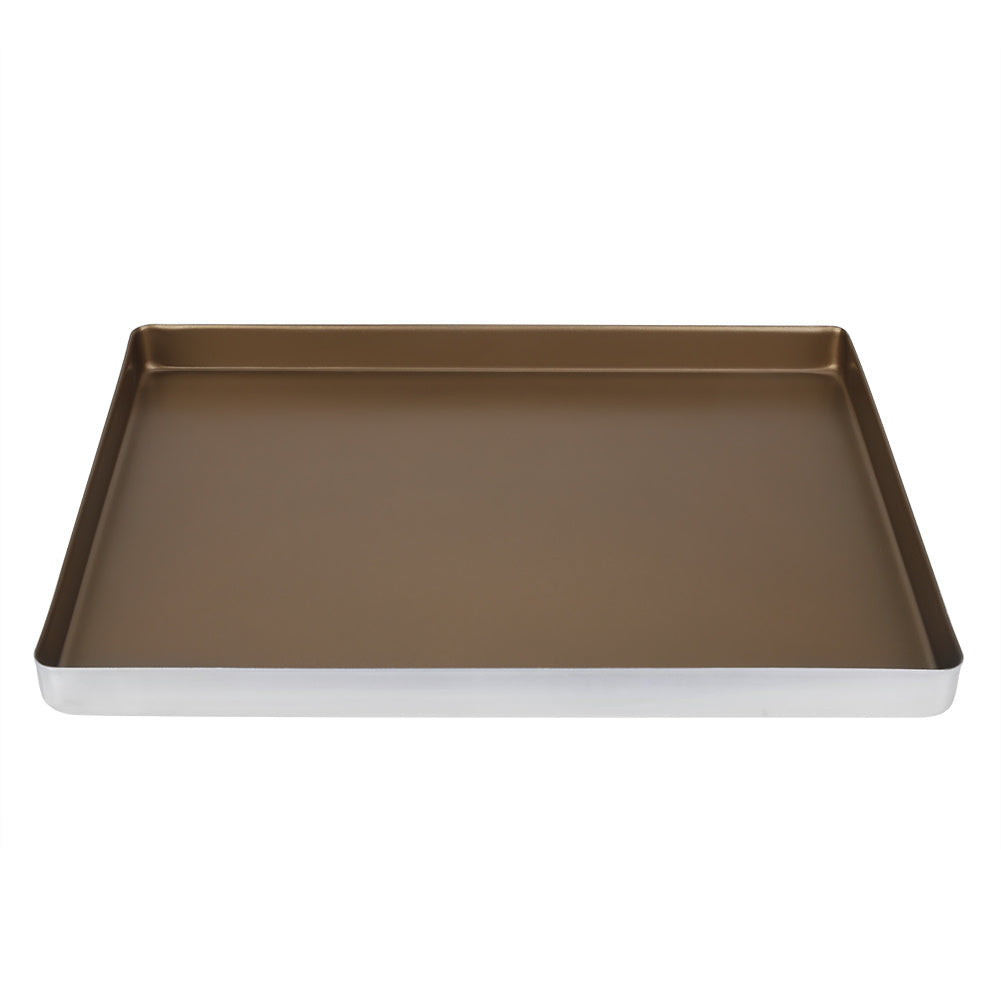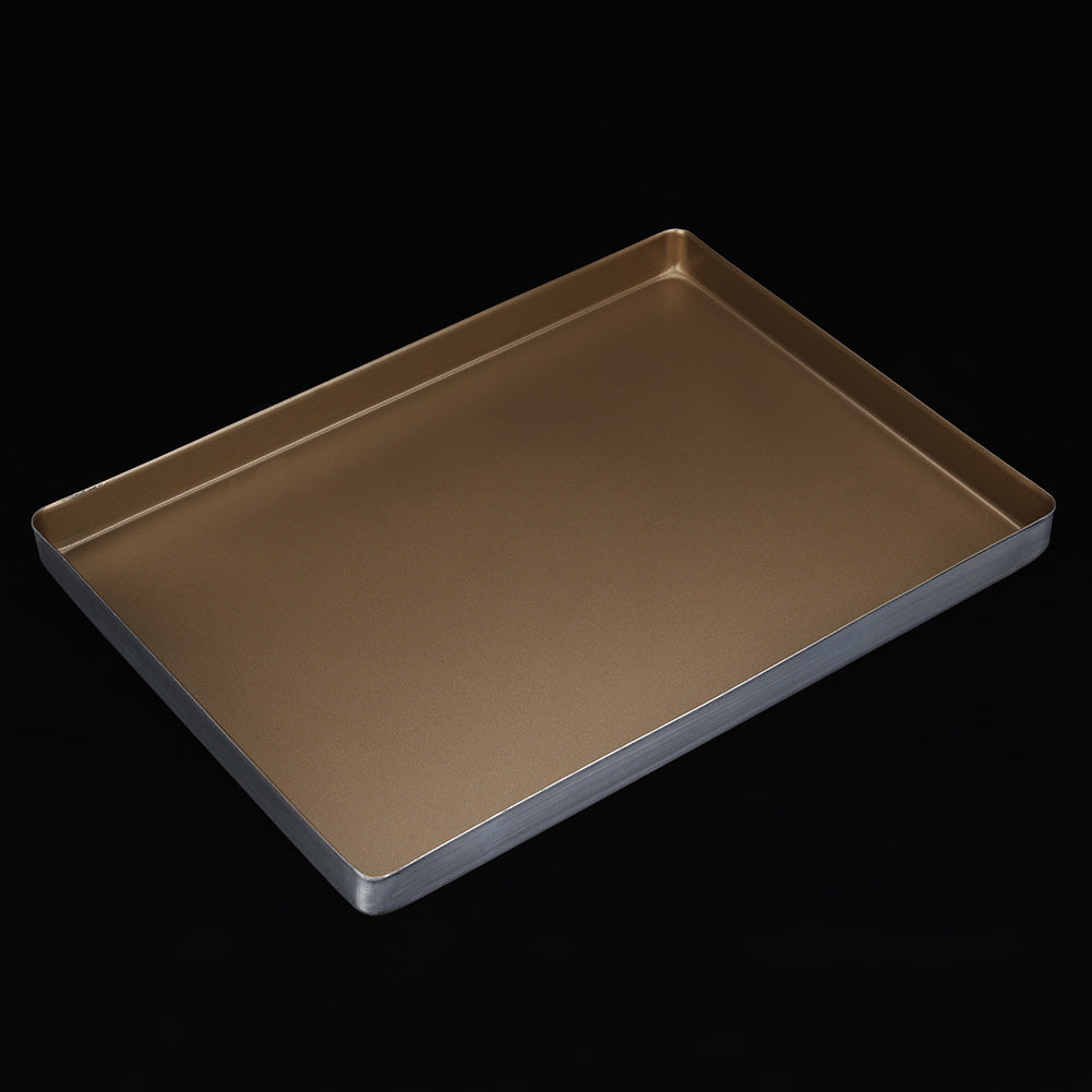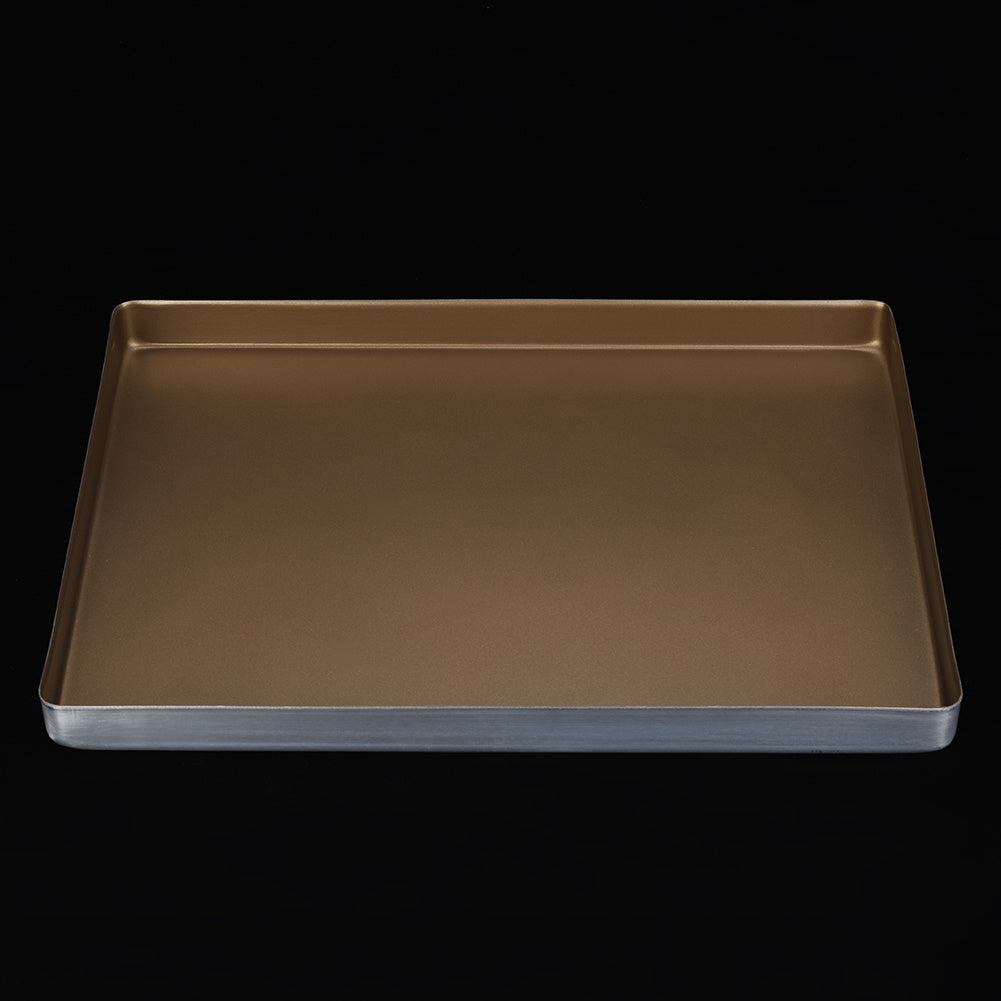 1、Non-stick design, very easy to use. 2、Special gold non-stick coating, easy to clean, oil-free, easy to demould, good tool for baking. 3、One-piece stretched product structure, no dead ends, no oil or cake liquid leakage, strong and durable. 4、Made of 1.5mm aluminum alloy, high strength, light weight and durability, corrosion resistance and good thermal conductivity. 5、40 * 30 optimum size and thickness for home ovens.