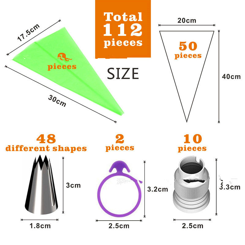 Purpose: Home baking DIY pastry cake decorating use 112-piece set of cake cream decoration tools (multiple mouth styles and more bags, authentic 40cm long thick single-sided 7 wire PE bag, no cutting corners,)