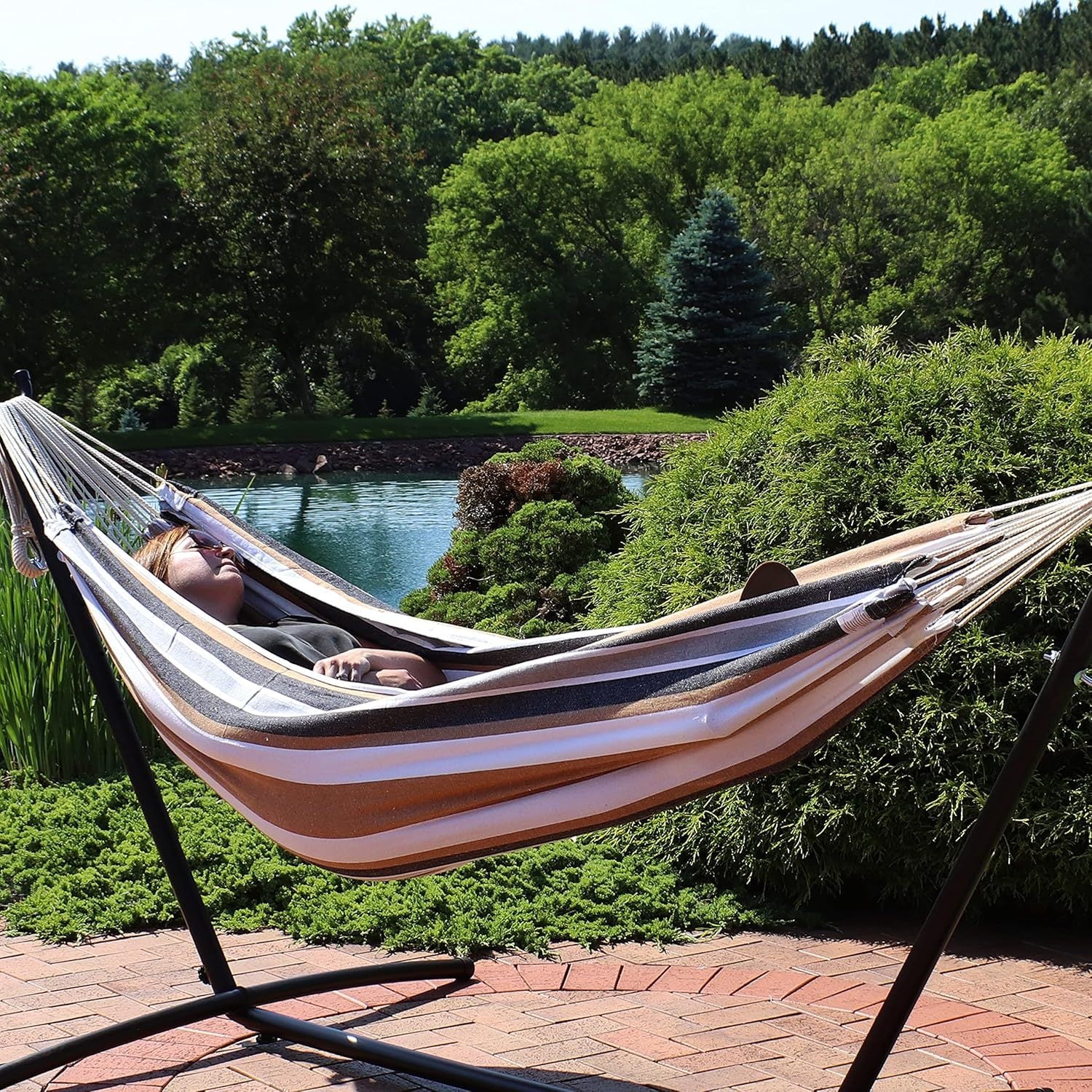 - COMFORT AND RELIABILITY: Heavy duty hammock features tightly woven colorfast cotton for extra comfort and relaxation. The freestanding hammock is perfect to hang on a tree, between poles, or stand (sold separately).