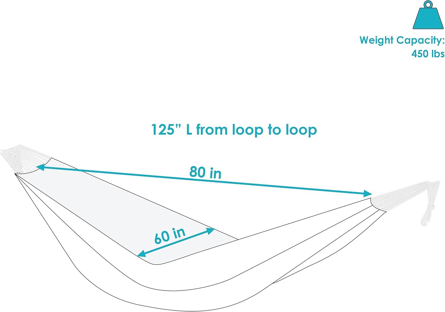 - GRAND SIZE: Large hammock is 125 inches long x 60 inches wide. Bed size is 80 inches long x 60 inches wide with a 450 pound capacity, making it a cozy two person hammock.