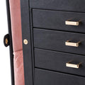 4. 4 Pull out drawers, includes a deeper bottom drawer and 3 equal size drawers. Drawer 1 has 4 earring cards and a ring roll. Drawer 2 has 12 equal size compartments. Drawer 3 has 4 equal size compartments. The deeper bottom drawer has only one compartment to store large jewelries. Each drawer is equipped with a delicate handle which can be opened easily