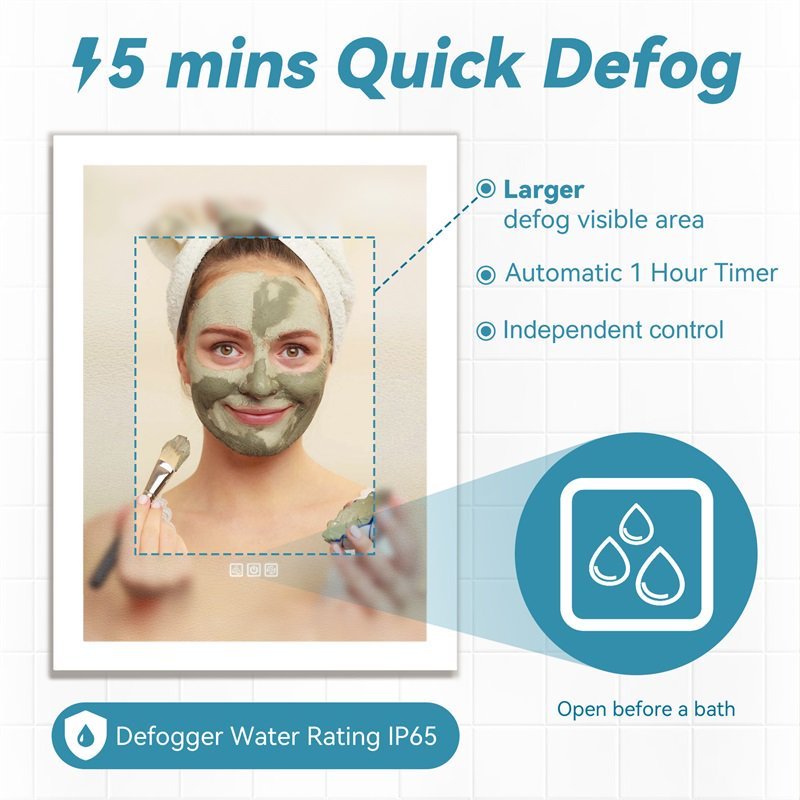 5-mins Quick Defog: UL listed mirror defogger with wider defog area, water rating IP65 better anti-wet performance