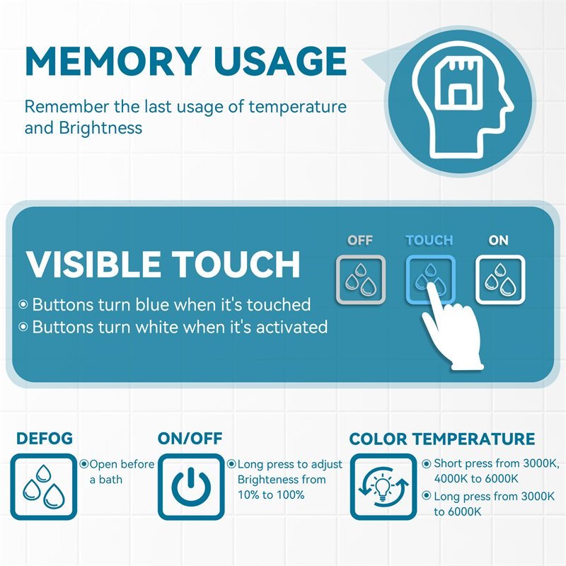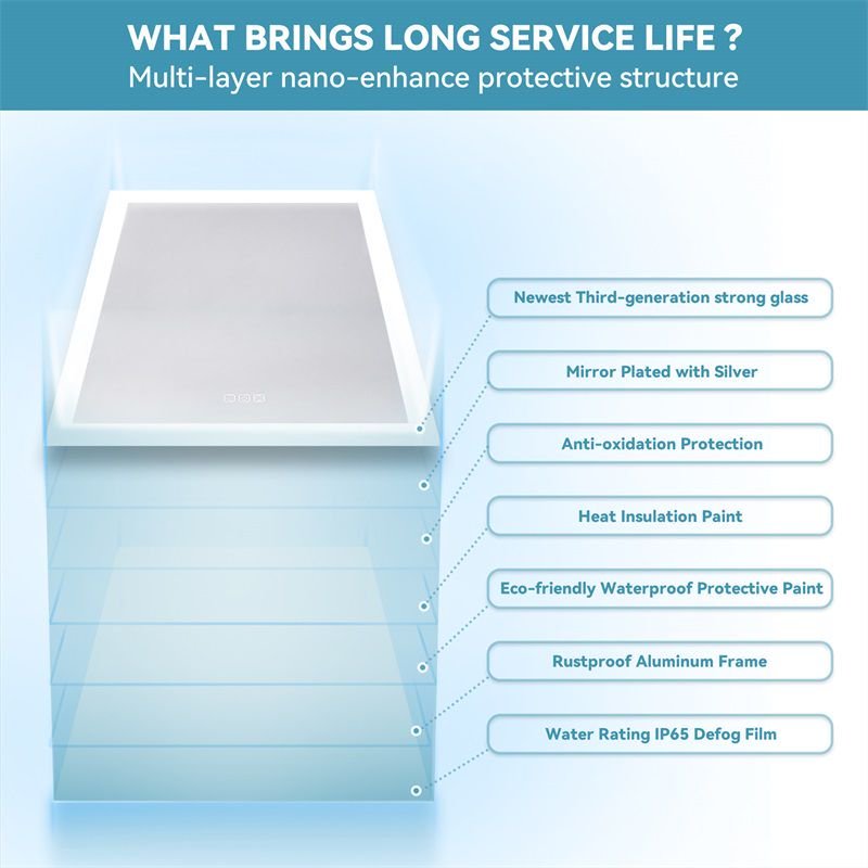【Double Protection】Silver-sand sprayed aluminum frame, galvanized metal backboard water rating IP44 protects the LED light. It will prevent the components inside corrosion and prevent mirror deformation in humid environments, which makes it a longer service life.