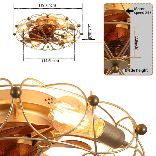 Low Profile Cage Ceiling Fan With Light Remote Control, Built-in Modern Industrial Ceiling Fan