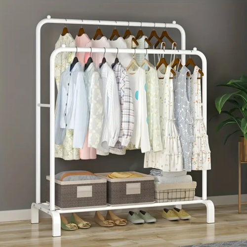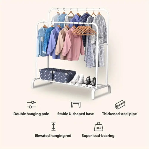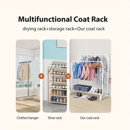 Practical Product Design: The bottom of the garment rack is a small shoe rack, you can use it to place shoes or shoe boxes, it not only gives you more storage space, it also makes the garment rack more stable.There are two non-slip beads on the top of the garment rack, which not only prevents the clothes from falling off, but also makes the garment rack look more beautiful.