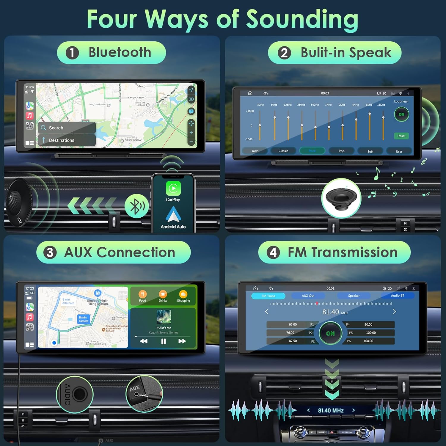 🔊 4 Ways Audio Output | Audio via Bluetooth, AUX cable, FM transmission, or built-in speaker. Enjoy high-quality, flexible sound output. |