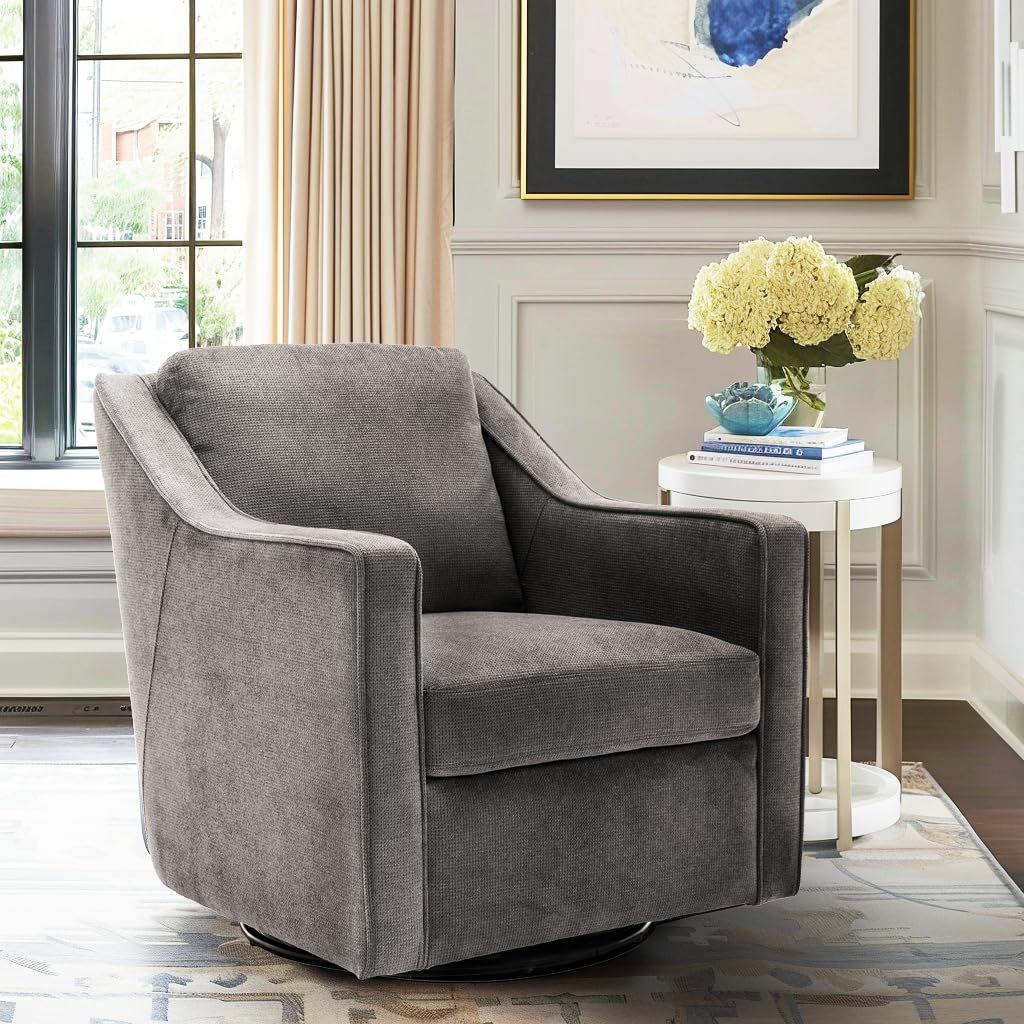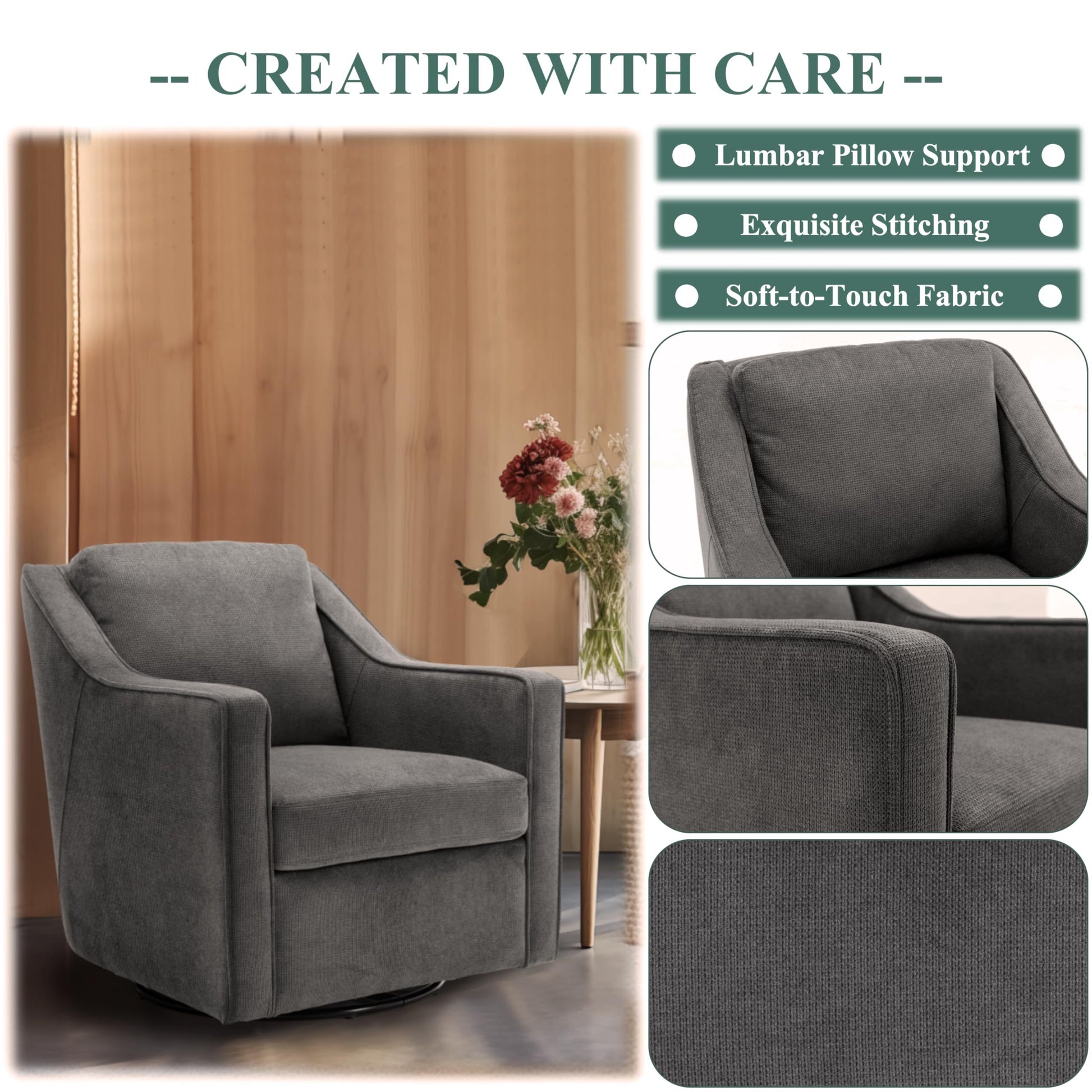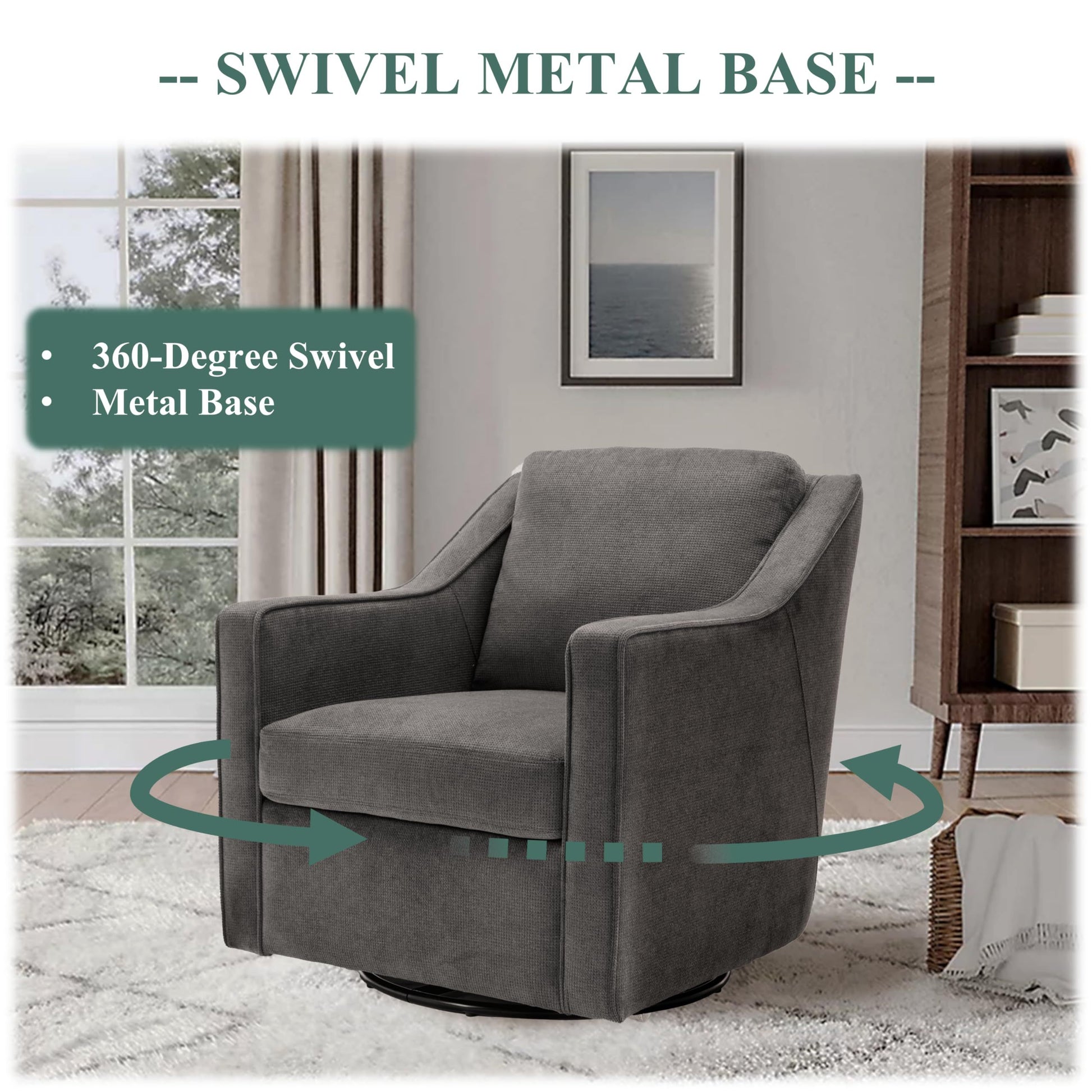 Comfort and Durability: Crafted from high-quality polyester with a solid 360-degree swivel metal base, this accent chair includes high-density thicker sponges for extended comfort during use. Plush Chenille Fabric: The barrel chair is covered in chenille fabric, known for its exceptional softness and plush texture. It's not only comfortable but also durable, capable of withstanding regular use. Mid-century Style: Ideal for enhancing any living space, this chair features a classic mid-century design with low saturation colors, adding a distinctive style and a touch of elegance to your living room, bedroom, or office setup. Designed with Traditional Elegance: The chair showcases traditional elegance with its classic track arms and stylish, angular shapes. Its unique design complements and enhances your existing décor. Optimal Size and Comfort: This chair is designed to perfectly match your space and furniture size. It boasts a thick padded cushion for prolonged comfort, making it an excellent addition to either a bedroom or a living area. Easy Assembly and Support: We prioritize your satisfaction! This chair comes with all necessary hardware and tools for a simple assembly process, taking just 10-15 minutes. For any inquiries, refer to our manual for contact information.