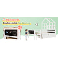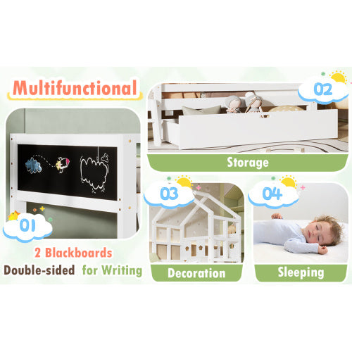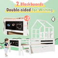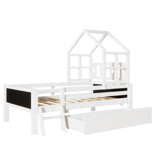 Twin Size House Bed With Ladder And Storage Drawers For Kid Bedroom,Solid Wood Platfrom Bedframe With 2 Blackboard Design, No Box Spring Needed, White