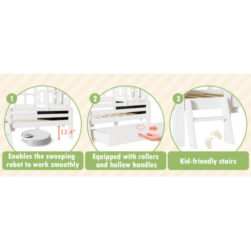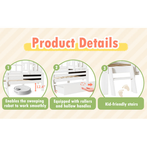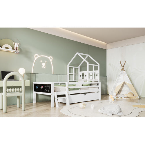 Product Name:Twin Size House Bed with Ladder and Storage Drawers for Kid Bedroom,Solid Wood Platfrom Bedframe with 2 Blackboard Design, No Box Spring Needed, White