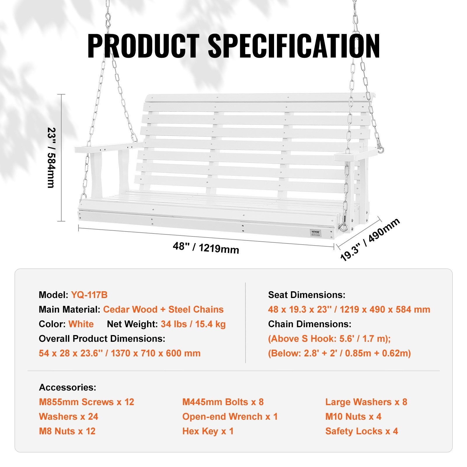 VEVOR Wooden Porch Swing 4.5 Ft, Patio Bench Swing For Courtyard & Garden, Upgraded 880 Lbs Strong Load Capacity, Heavy Duty Swing Chair Bench With Hanging Chains For Outdoors, White