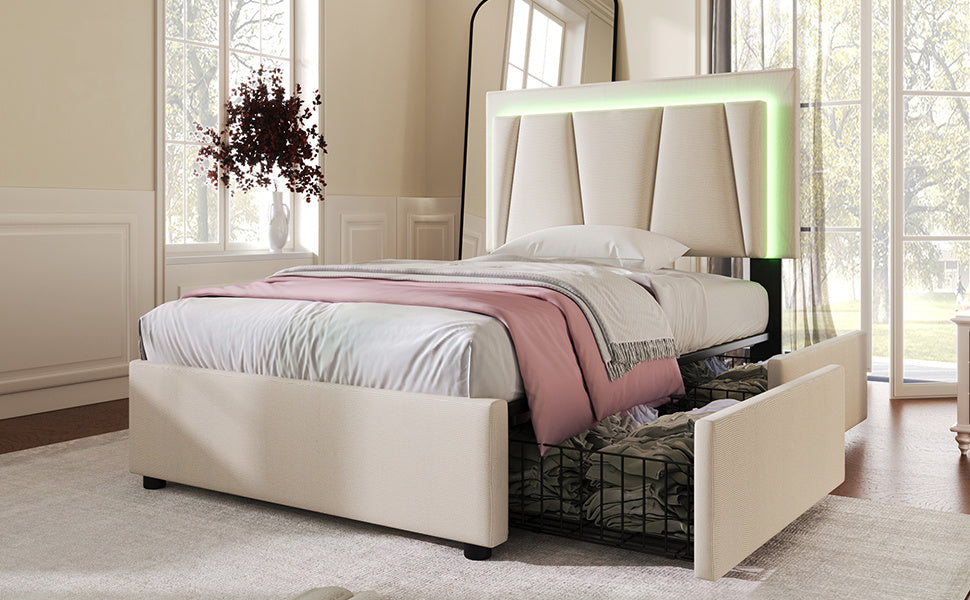 Product Name:Polsterbett mit LED-Beleuchtung und 2 Schubladen,Höhenverstellbarem Kopfteil,Einzelbett 90x200cm Stauraumbetten Bettgestell, Lattenrost aus Holz, Beige (Ohne Matratze)